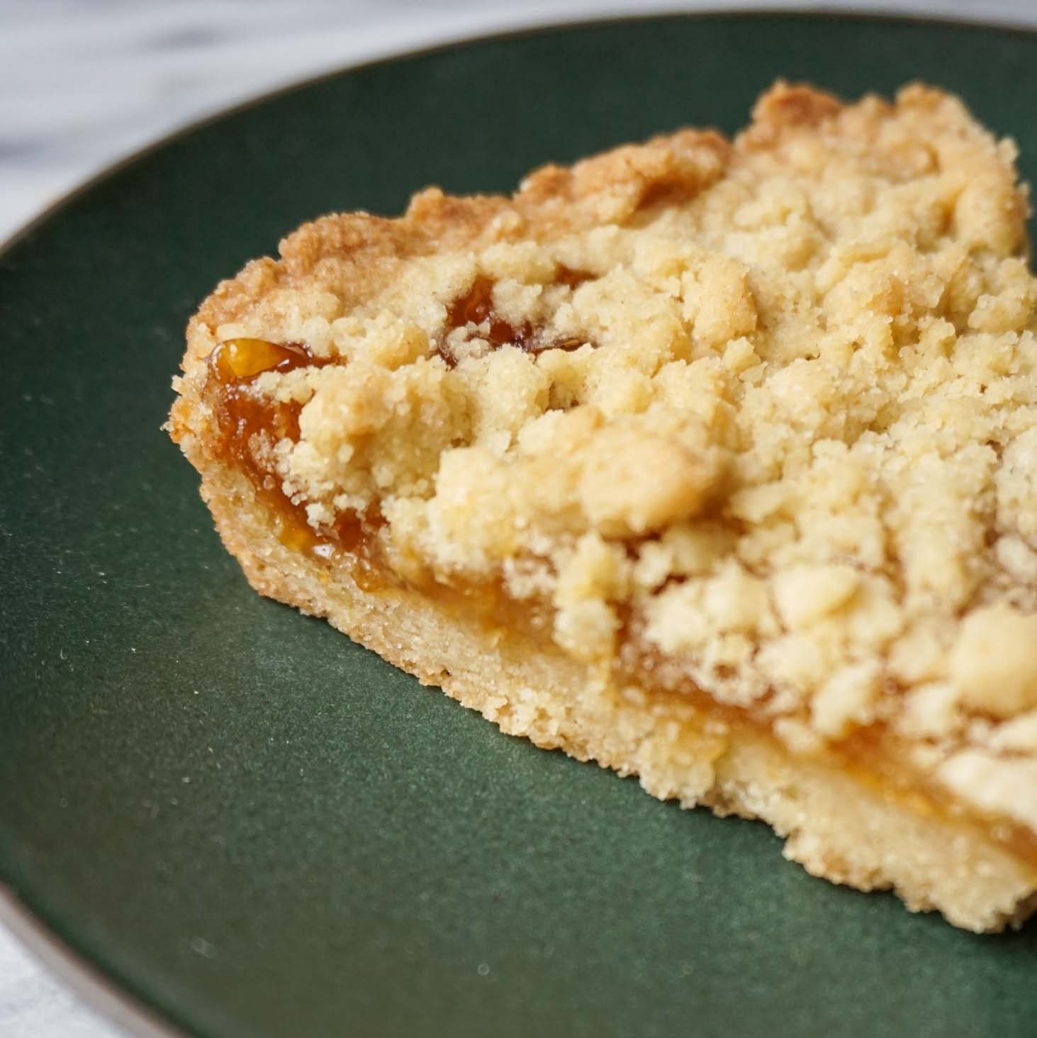 - On top of the shortbread, put spoonfuls of the apricot jam evenly around the shortbread. Then spread the jam into an even layer leaving about ½ inch border around the edges.